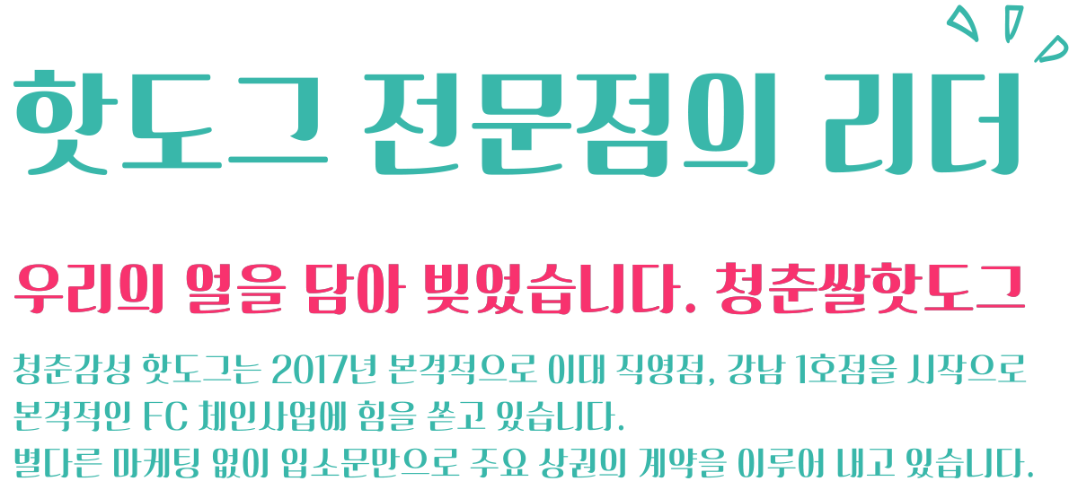 청춘쌀핫도그 청춘감성쌀 핫도그는 2017년 본격적으로 이대 직영점, 강남 1호점을 시작으로 본격적인 FC체인사업에 힘을 쏟고 있습니다.
